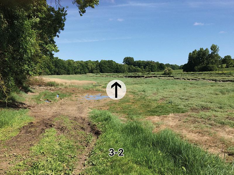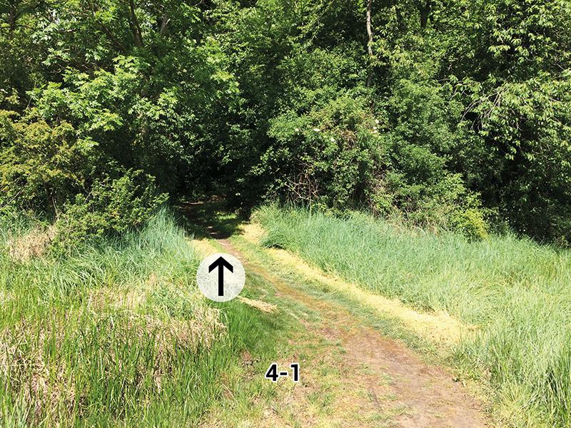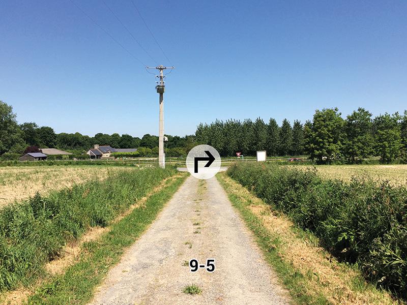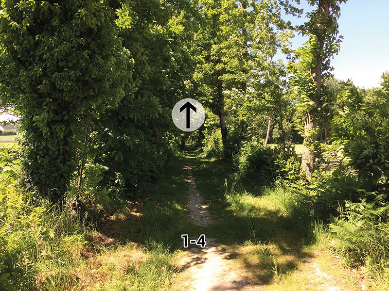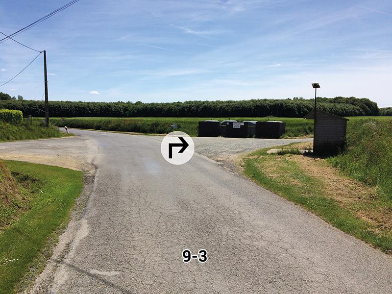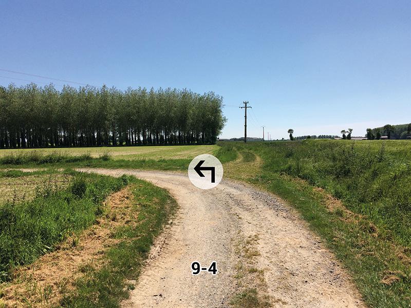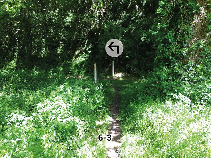 Arrivé à 50 m environ avant la route départementale, entre un site de tri sélectif et un abri bus, emprunter à droite un chemin de terre,
