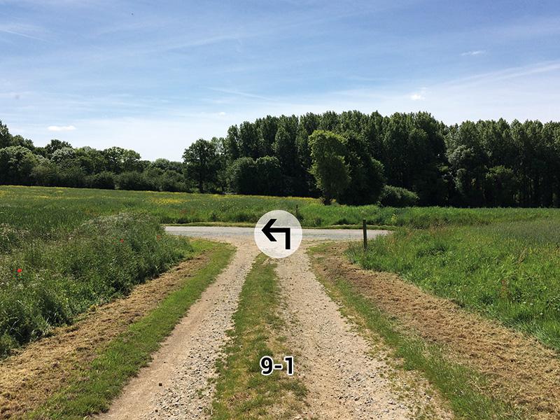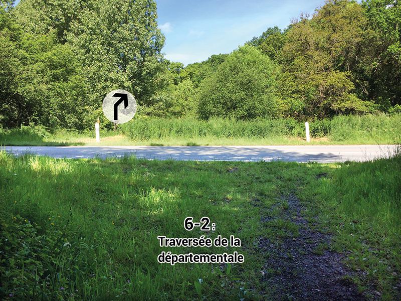 Ce chemin ramène à la route départementale en faisant un coude vers la gauche.