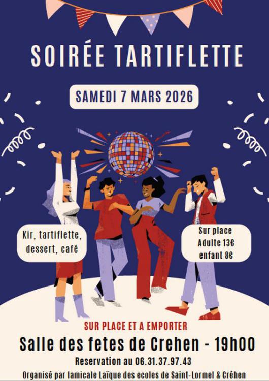 Nous vous donnons rendez-vous le samedi 7 mars à la salle des fêtes de Créhen pour une soirée tartiflette sur place ou à emporter.
