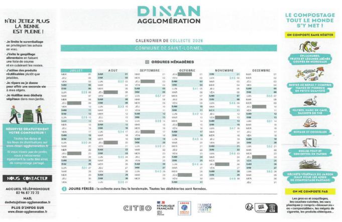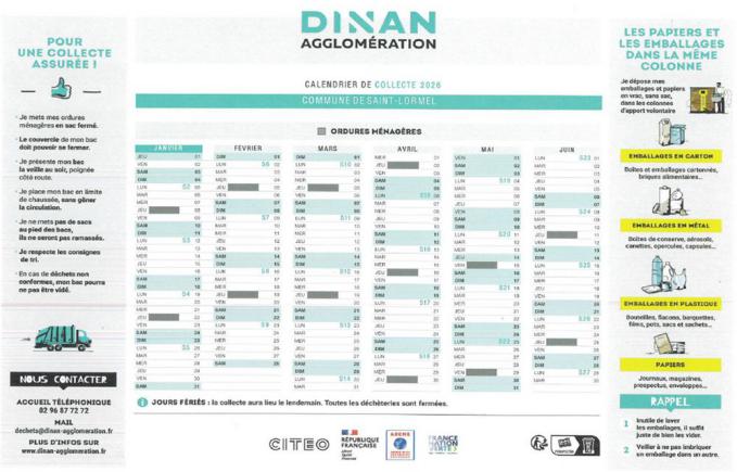 Des calendriers de collecte ont été créés pour chaque commune. Un exemplaire vous sera distribué en boîte aux lettres avec un mémo-tri afin de vous faciliter le tri quotidien (des exemplaires seront à votre disposition en mairie ou en ligne sur le site de Dinan Agglomération).